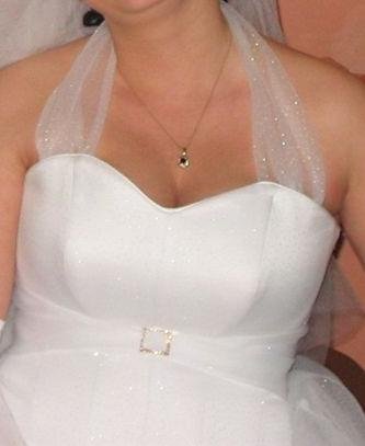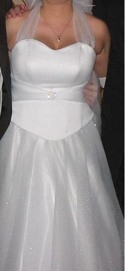 Sprzedam przepiękna suknię ślubną, w śnieżnobiałym kolorze z delikatnymi drobinkami brokatu. Rozmiar 38-42 wzrost około 170cm. Gorset jest regulowany, spódnica ma wszytą gumkę, dołączona jest również halka oraz koło. Zakupiona w salonie sukien ślubnych, użyta tylko raz. Suknia pomimo swojego bogatego wyglądu jest bardzo lekka i nie utrudnia poruszania się. Gwarantowany zachwyt gości. Dla bardziej subtelnego wyglądu doszyte zostały ramiączka wiązane na szyi, co różni ją od oryginału producenta. Dodatkowo GRATIS welon, idealnie dopasowany do sukni + rękawiczki widoczne na zdjęciu.