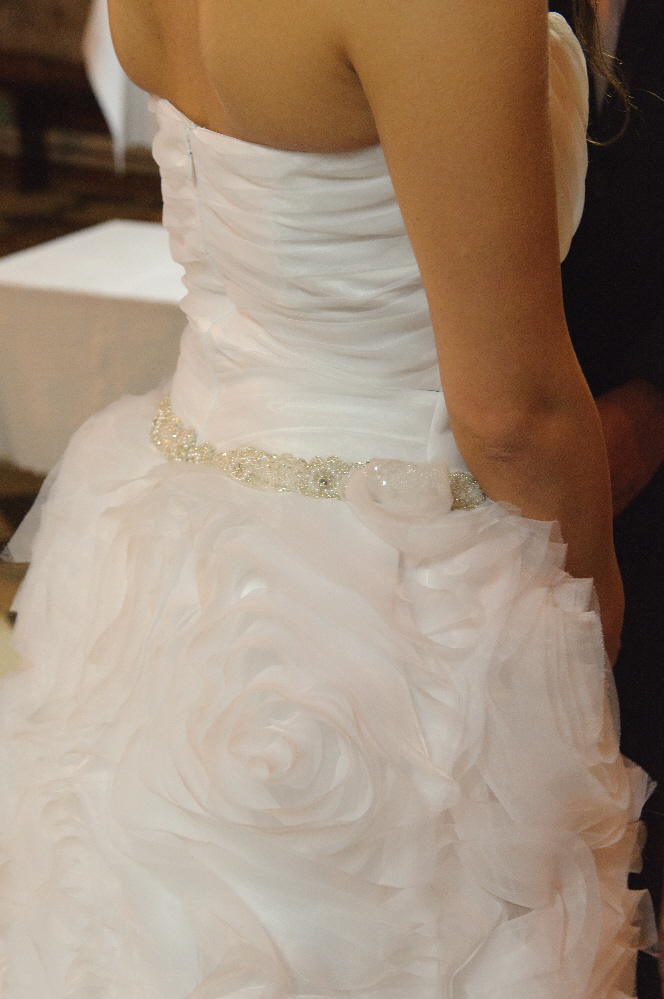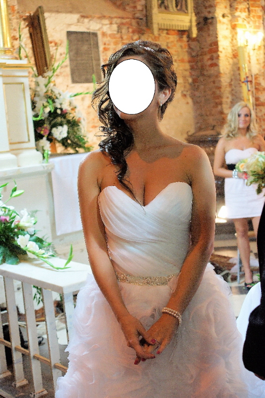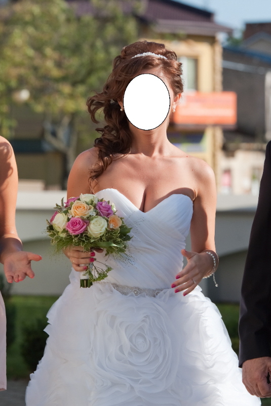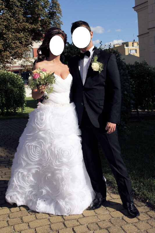 Włoska suknia ślubna koloru białego. Suknia z gorsetem posiadającym delikatny paseczek ozdobiony koralikami i perełkami, dół sukni posiada wzór róży. Suknia posiada podpinany tren. Stan bardzo dobry. Suknia zakupiona w jednym z warszawskich salonów - jej wartość 5000 zł - posiadam paragon zakupu sukni