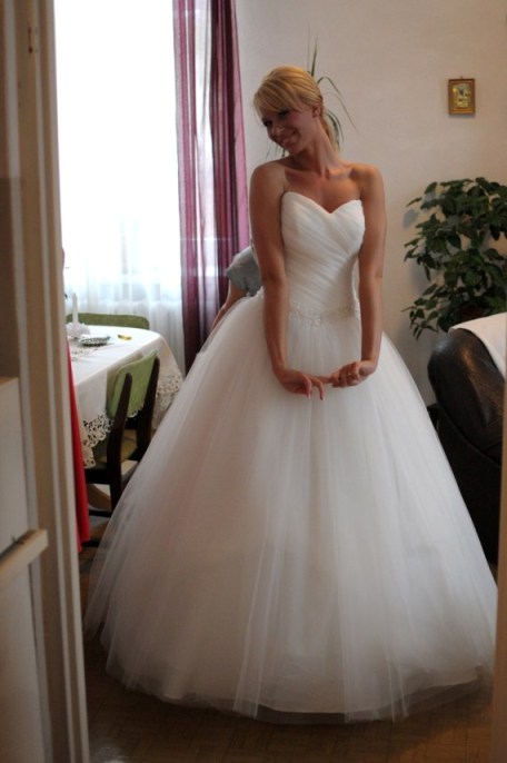 Boska suknia ślubna. Bardzo lekka i wygodna - serdecznie polecam. Wiązany gorset umożliwia dopasowanie do Kobiet o różnych wymiarach. Wszyscy goście byli zachwyceni suknią nie wspominając o o Panu Młodym. Suknia na żywo prezentuje się jeszcze piękniej!!