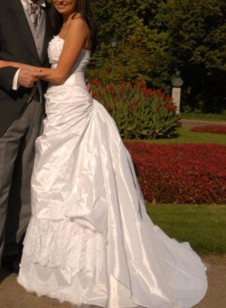 Suknia ślubna Racine firmy Cymbeline jest w rozm.38/40 w kolorze śnieżnej bieli. Sukienka składa się z trzech części : spódnica z kilku warstw jedwabnej tafty z trenem, który można upiąć – są tam elementy koronki, sznurowany koronkowy gorset i bolerko z francuskiej koronki. Suknia jest bardzo wygodna i co najważniejsze – lekka. To jedna z najpiękniejszych sukienek ślubnych, o czym świadczy też fakt, że jako jedyna znalazła się ponownie w nowej kolekcji Cymbeline. Suknia jest po praniu w pralni firmowego salonu. Specjalnie uszytą halkę, dającą sukni charakteru z dawnej epoki, dodaję gratis. Jestem pierwszą właścicielką tej sukni.