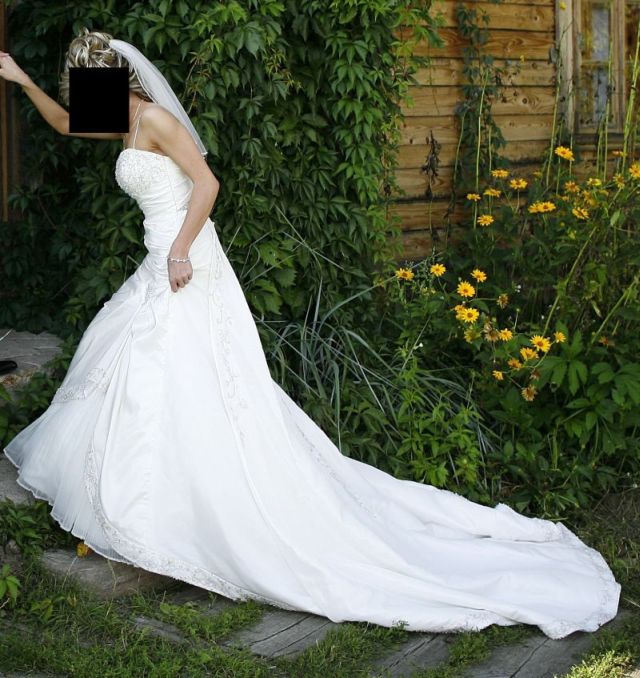 Mam do sprzedania przepiękną, ekskluzywną suknię ślubną włoskiego projektanta Eddy K. Suknia jest w rozmiarze 36 na wzrost 160 cm + 5 cm. Suknia w przepięknym kolorze kości słoniowej. Zawiera liczne zdobienia kryształami Swarovskiego. Suknia posiada długi tren, który można podpiąc. Suknia dodatkowo posiada ramiączka, również zdobione kryształami Swarovskiego. Do sukni dołączony jest równie gustowny,wpinany welon.