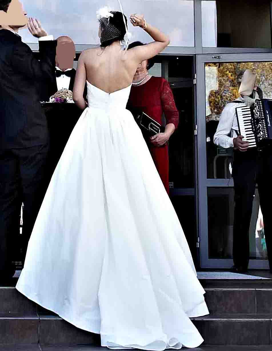 - jednoczęściowa suknia z rozłożystym dołem oraz atrakcyjnym podpinanym trenem, na którym umieszczone są perłowe ozdobne guziczki;
