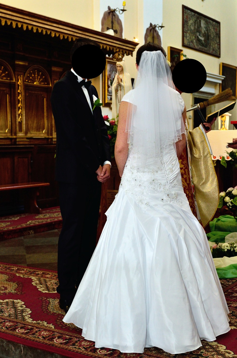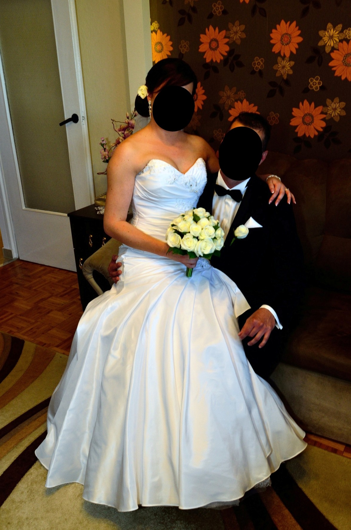 Posiadam do sprzedania piękną suknię ślubną od Maggie Sottero - model Jovi. Suknia zakupiona została w salonie "Tylko Ona" w Warszawie. Jest jednoczęściowa w kształcie literki A. Została uszyta z tafty koloru białego, dekolt w kształcie serduszka wyjątkowo podkreśla biust. Przód sukni bogato zdobiony koralikami, kamyczkami Swarovskiego, oraz haftem wykonanym srebrną nicią. Wszystko to tworzy piękny motyw kwiatowy okalający lewy bok aż do wiązania z tyłu . Na dole sukni, z lewej strony znajduje się wstawka na wzór górnej części sukni. Z tyłu suknia posiada wiązanie wstążką w kształcie litery V.