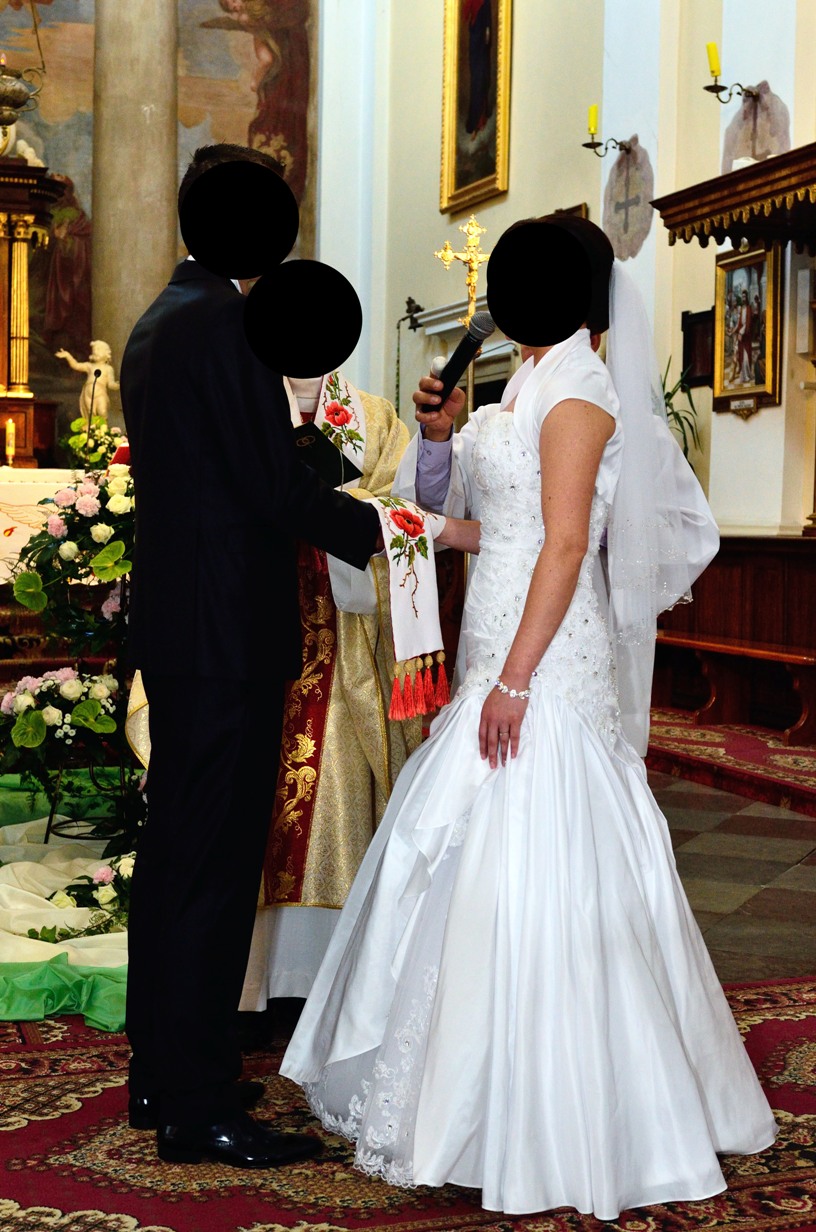 W komplecie do sukni dodaję bolerko szyte z identycznego materiału jak suknia, halkę i podwiązkę.