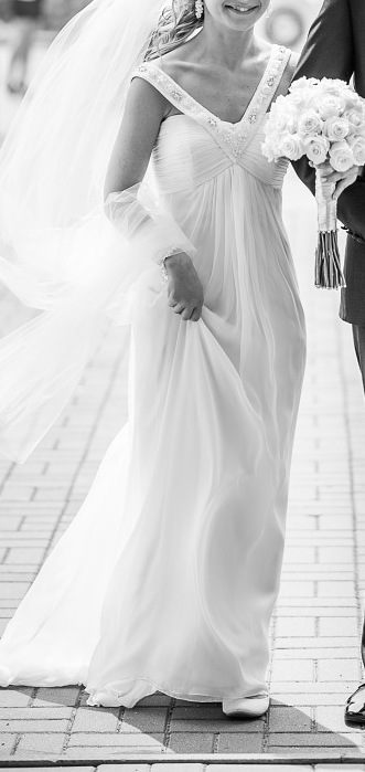 Zjawiskowa i elegancka suknia z delikatnego materiału w kolorze śmietankowej bieli. Suknia niezwykle lekka i wygodna. Ramiączka pięknie zdobione wyszywanymi perełkami i kryształkami. Nie gniecie się i ślicznie układa się również po podpięciu trenu. Nie wymaga biustonosza, pięknie podkreśla i utrzymuje biust.