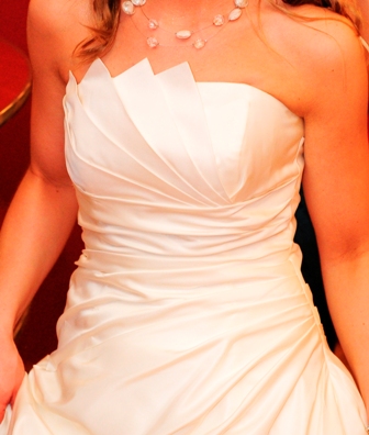 Suknia wykonana z bardzo dobrej jakości atlasu. Posiada wszyte miseczki. Suknia jest jednoczęściowa ze sznurowanym gorsetem.