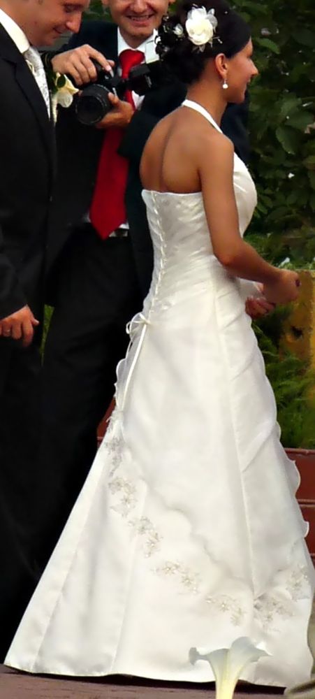 Piękna , subtelnie zdobiona, z delikatnym połyskiem. Suknia na bardzo szczupłą dziewczynę. Długość sukienki na osobę ok. 150-160cm, w zależności od obcasów.Jednoczęściowa ze sznurowanym gorsetem, na kole. Bardzo lekka, bardzo wygodna.Stan idealny. rewelacyjna dla dziewczyn z dużym, średnim i małym biustem, gdyż jest sznurowana na plecach - możliwość dopasowania w talii i biuście. cena 800zł.