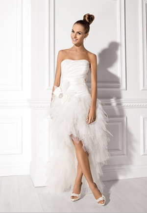 Suknia ślubna gorsetowa, typowa hiszpanka. Można odpiąć dolną część i pozostać w krótkiej sukni.