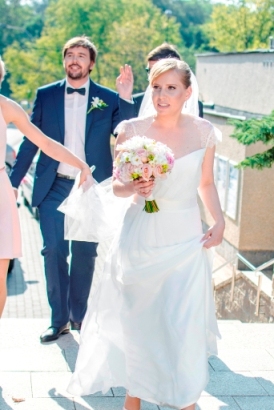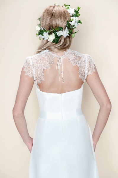 Romantyczna suknia z koronkowymi rękawkami. Lekka i wygodna, idealna na letni ślub kościelny lub cywilny.
