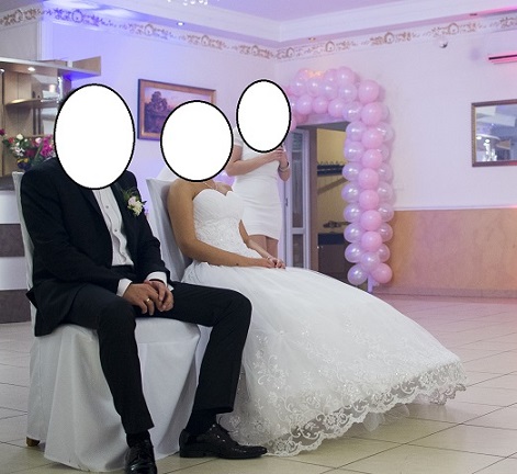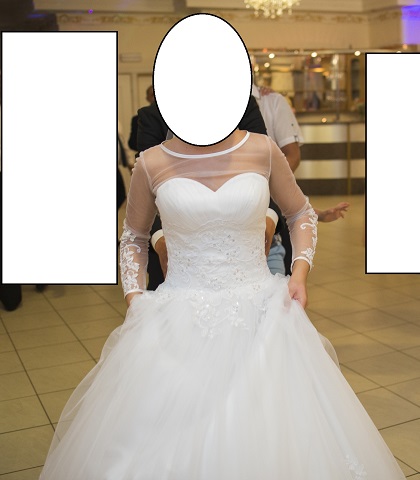 Suknia jednoczęściowa w kolorze białym. Gorset usztywniany w kształcie serca pokryty koronką. Tył sukni jest częściowo na suwak, a reszta sznurowana, co pozwala na doskonałe dopasowanie się do kształtu ciała. Dół sukni ślubnej również pokryty jest koronką.