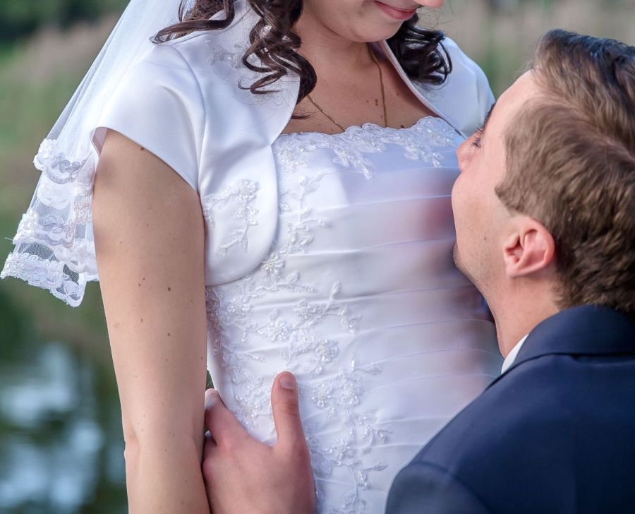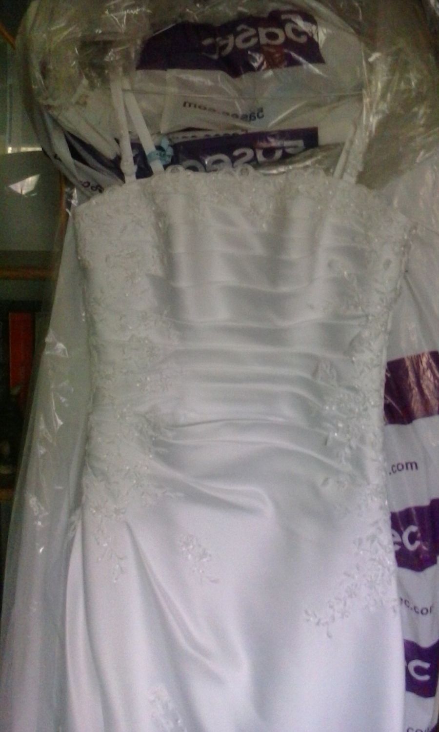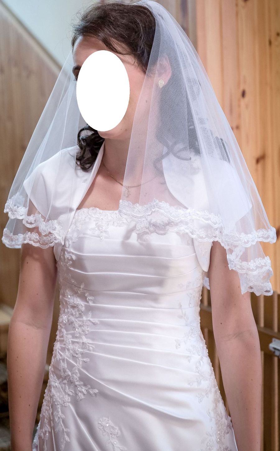 Biała atłasowa suknia typu A, z marszczeniem w tali. Suknia jest na ramiączka i ma bolerko.(mama dwa- z krótkim rękawkiem i 3/4). Na sukni naszyto białe-koronkowe aplikacje. W komplecie jest halka z kołem. Do sukni chętnie dołożę welon oraz sztuczne kwiaty do ozdobienia samochodu.