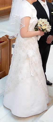 klasyczna jednoczęściowa suknia z białej tafty, pokryta złotą koronką, na halce z kołem, zapięcie na suwak z boku, optycznie wyszczupla sylwetkę. Dodatki: bolerko, krótki welon wpinany na grzebyk