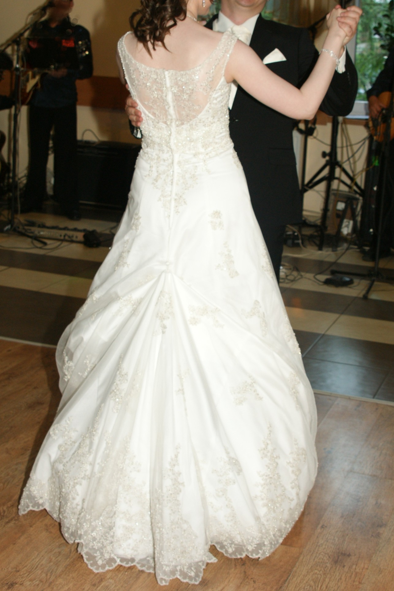 Piękna i wyjątkowa suknia z kolekcji 2010r francuskiej firmy HERMS, model Ember – kolor ecru z platynową koronką i zdobieniami. Suknia jednoczęściowa w kształcie litery A z zalotnymi koronkowymi ramiączkami, rozmiar 36/38 (z możliwością zwiększenia lub zmniejszenia)– wzrost 170cm + 5-7cm obcas. Wszyte miseczki push-up dzięki którym suknia subtelnie eksponuje nie tylko biust ale tez i plecy. Zdobiona pięknym haftem. Z tyłu długi, podpinany tren nadający sukni bajkowości. Można poczuć się jak prawdziwa księżniczka ;-) Stan idealny.Do sukni dołączam halkę i tiarę. Zainteresowane osoby zapraszam do kontaktu.