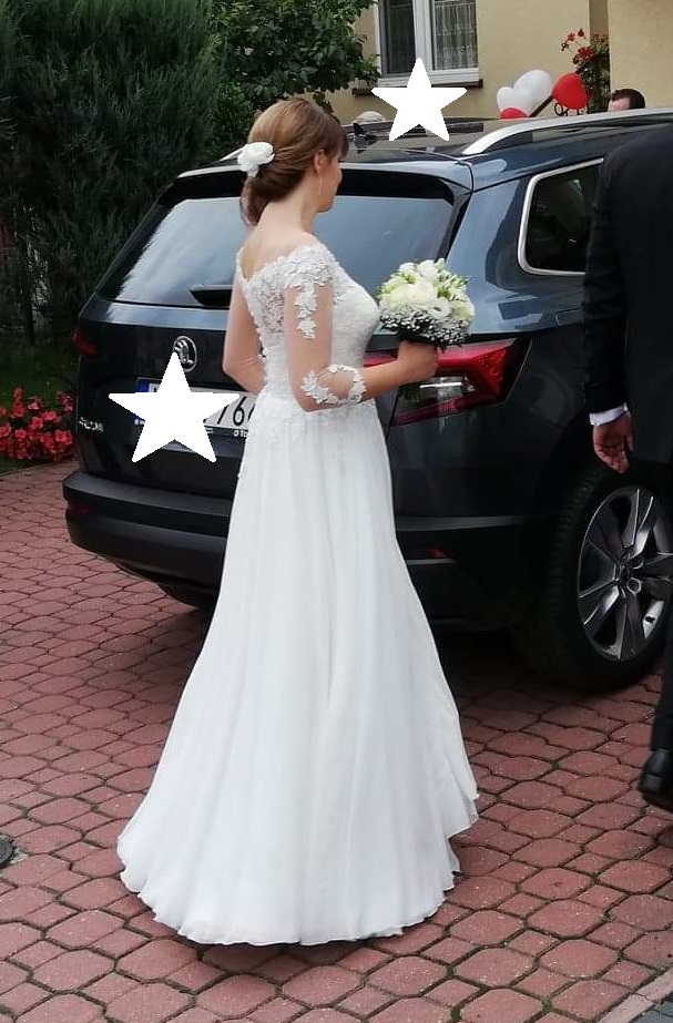 Suknia uszyta z dwóch modeli, tj. góra – z kolekcji Agnes, koronkowa, z rękawem ¾, łódka, dół – kolekcja Pret-a-porter, muślinowy, rozporek do wysokości uda.