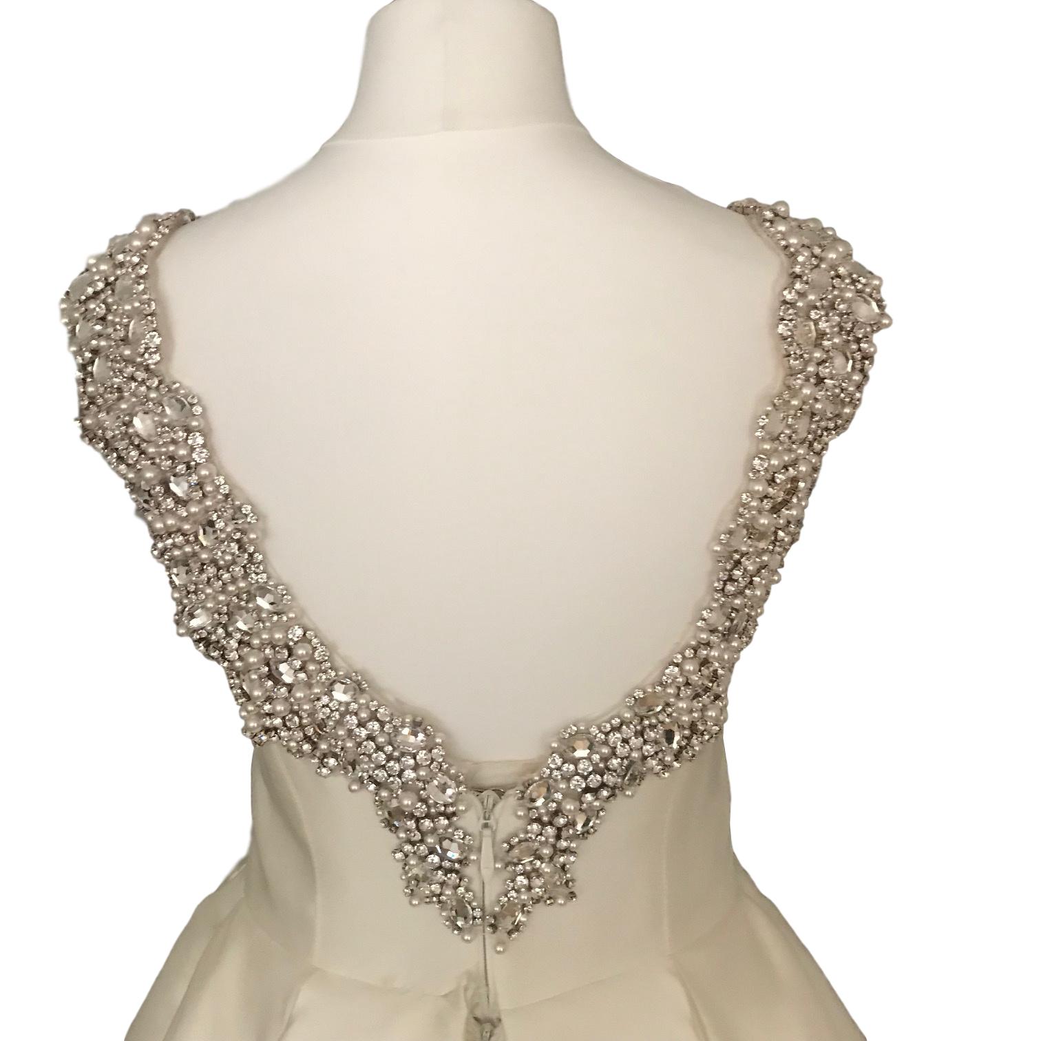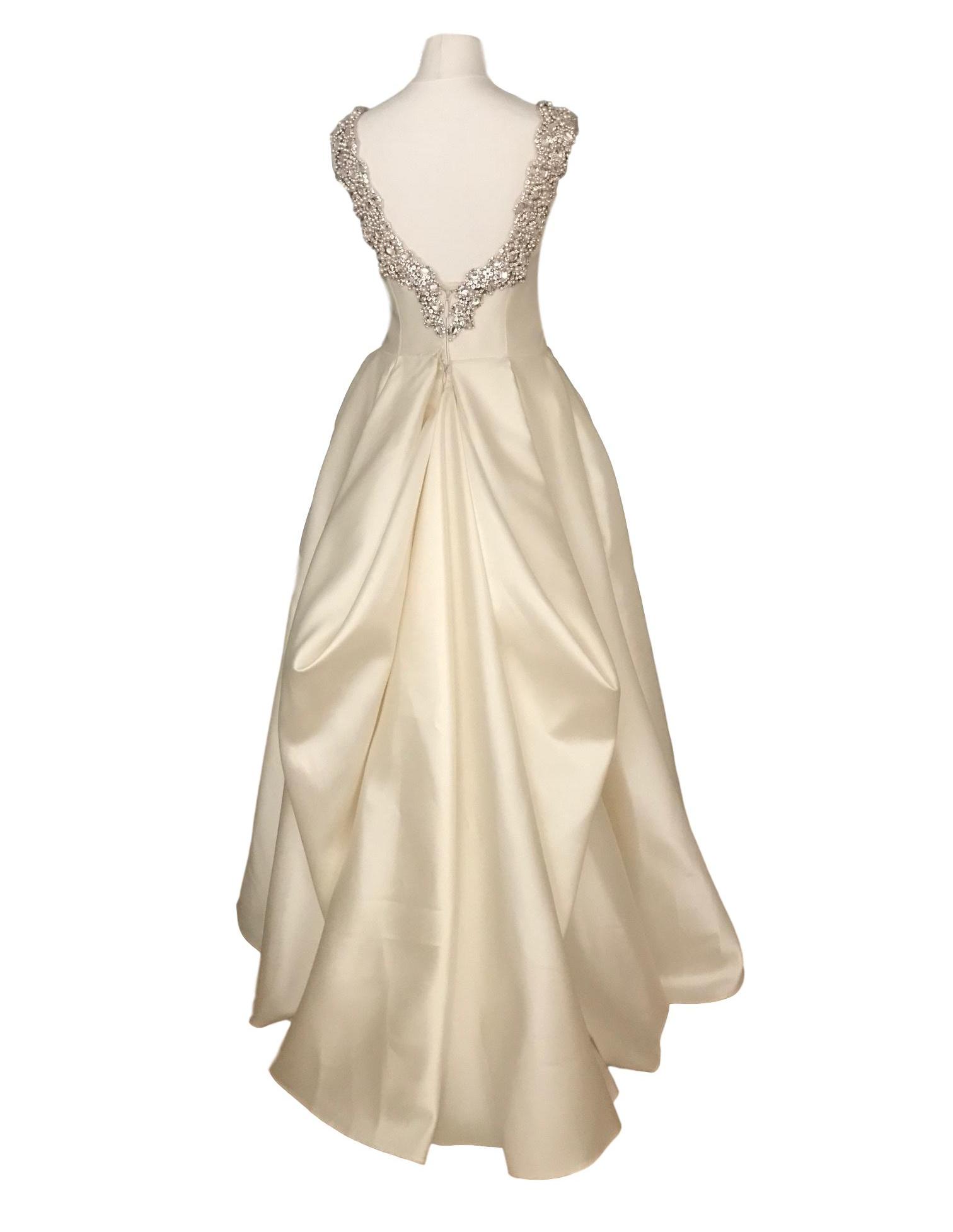 Subtelnie odsłonięte, bogato zdobione plecy sprawiają wrażenie zmysłowej elegancji.