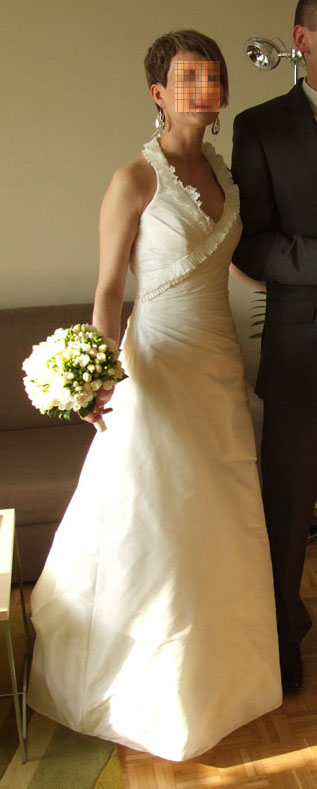 Ze względu na formę w kształcie litery A efektownie wysmukla sylwetkę. Biust zostaje pięknie uwydatniony dzięki wiązaniu na szyi. Gwarantuje ono również, że nawet przy największych szaleństwach w tańcu wszystko pozostaje na swoim miejscu :) Na dekoldzie znajdują się subtelne aplikacje z delikatnie mieniących się koralików. Wiązanie gorsetowe z tyłu umożliwia podkreślenie wcięcia w talii, a delikatny tren dodaje całości uroku.