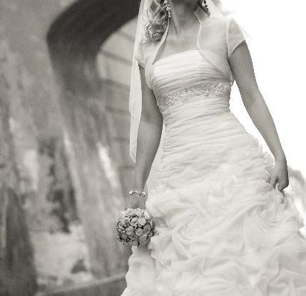 Suknia jest lekka, w górnej części dobrze dopasowana, koloru ecrii, . Z Tyłu wiązana. W komplecie dwa welony (długi i krótki) i bolerko.