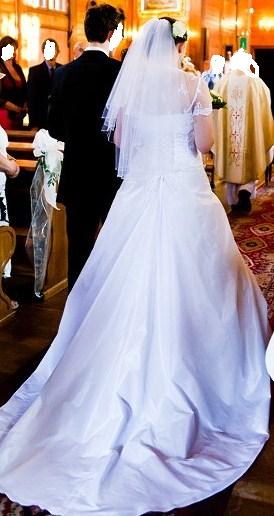 Rozmiar 42, wzrost 173cm+obcas 7cm, na duży biust, śnieżnobiała, robiona na zamówienie. Zapłaciłam za nią 2500zł. Sznurowana z tyłu (możliwość regulacji). Suknia ma tren, ale po ślubie można go podczepić, co daje bardzo fajny efekt wizualny.