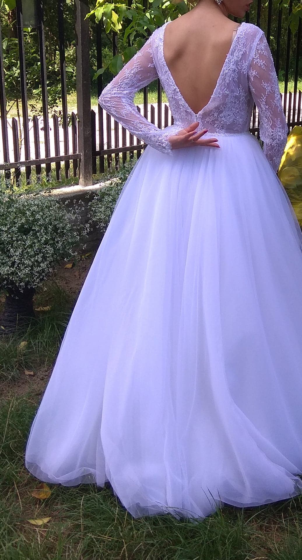 Sprzedam piękną suknię ślubną zakupioną w salonie Adria w Tłuszczu. Suknia zakupiona za 4500 zł Suknia jest bardzo lekka, wygodna i zwiewna. Cudownie układa się w tańcu. Góra szyta ręcznie, koronka plus koraliki. Długi rękaw również wykończony koronką. Tył sukni mocno wycięty w literę V co daje efekt odkrytych pleców.