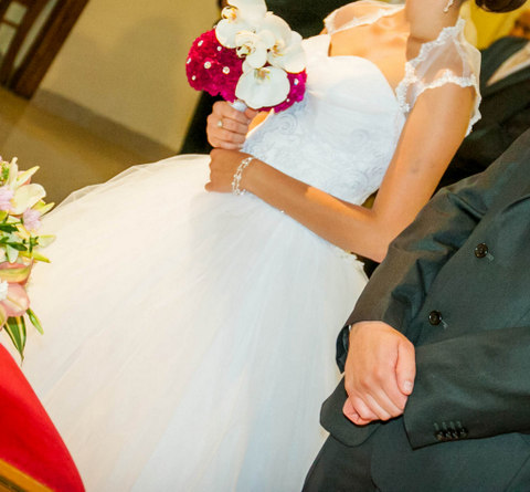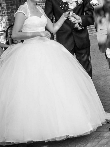 Sprzedam śliczną suknię ślubną(jednoczęściową), szytą na zamówienie. Gorset sukni wyszywany koronką, w pasie pasek z cyrkoni. Dół sukni z gładki, z pięknie mieniącego sie tiulu. Suknia w stanie bardzo dobrym. Jedynym uszczerbkiem jest porwana wierzchnia warstwa tiulu na samym dole (na życzenie klientki wymienię ją w salonie). Suknia w rozmiarze 38(wiązany gorset umożliwi dopasowanie do sylwetki) szyta na wzrost 168 cm+7 cm obcas. Dół sukni gładki co w razie potrzeby pozwoli na jej skrócenie. Do sukni dorzucę bolerko, ładnie wykończone koronką oraz 2 metrowy tren, dopinany na 3 niewidoczne guziczki. W zestawie także halka na dwóch kołach. Dzięki niej pięknie się układa. Suknia lekka i wygodna :)