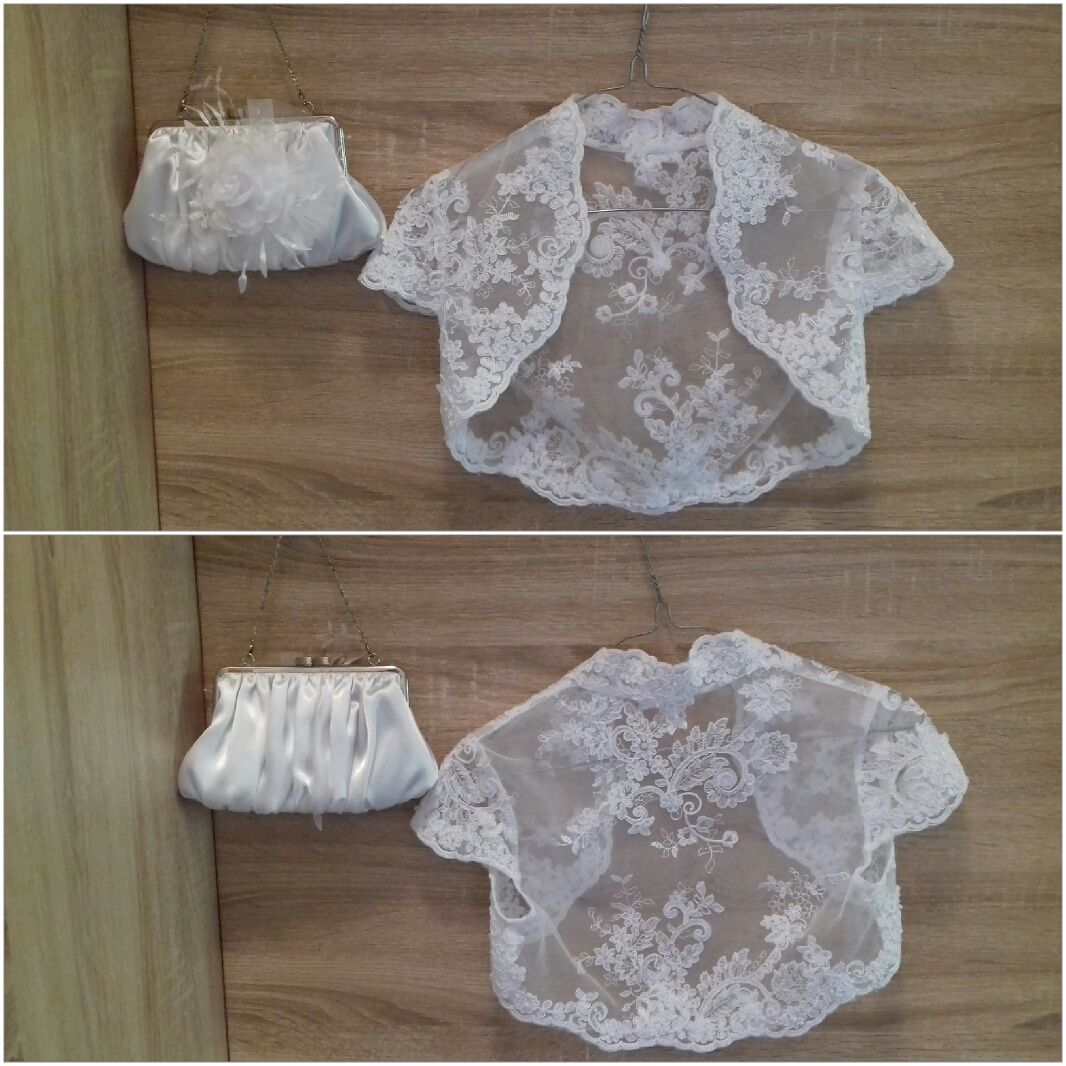 - do sukni mam w cenie bolerko, halkę, ozdobę do włosów pasującą do koralików na pasie sukni oraz torebkę.