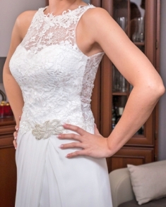 ponieważ jest lekka i zwiewna, nie krępuje ruchów. Atutem sukni jest piękna koronkowa góra z tyłu ozdobiona guziczkami oraz rozcięcie w dolnej części ozdobione koronkowa halką. Suknia jest w rozmiarze 34/36, na wzrost 168 cm plus obcas ok 8 cm.