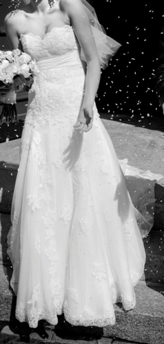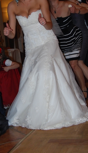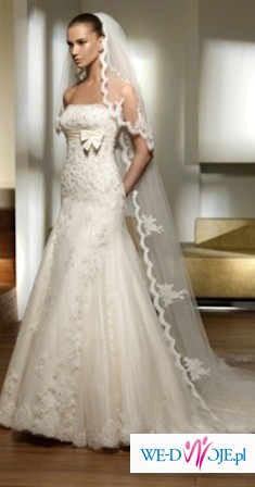 suknia SAN PATRICK model Prisma. Przepiękna suknia w kolorze ecru/perłowym, zdobiona hiszpańskimi koronkami oraz kamieniami Svarowskiego. Rozmiar 36, wzrost 172 + obcas 5 cm. Suknia kupiona w profesionalnym salonie Adeline. Dzięki gorsetowi wyciętemu w serce twój biust będzie prezentował się wyśmienicie.
