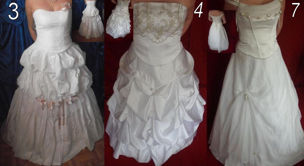 Posiadają perełkowe zdobienia jak i zdobienia kamykami Swarovskiego. Niektóre z sukni zdobione sa złotą i srebrną nicią plus różnego rodzaju koronkami. Suknie jak widać na zdjęciu nie są zniszczone, nie posiadają żadnych uszkodzeń suknie były użyte tylko jako suknie wystawowe w salonie koszt sukni wynosił 2000zł lecz z powodu likwidacji salonu suknie kosztuje duzo mniej..