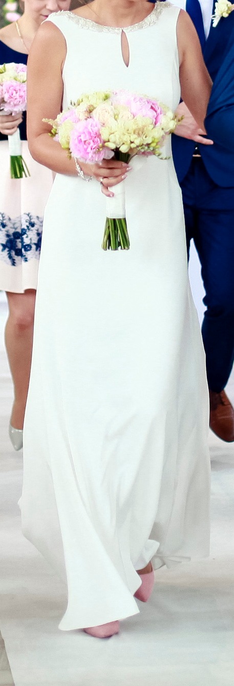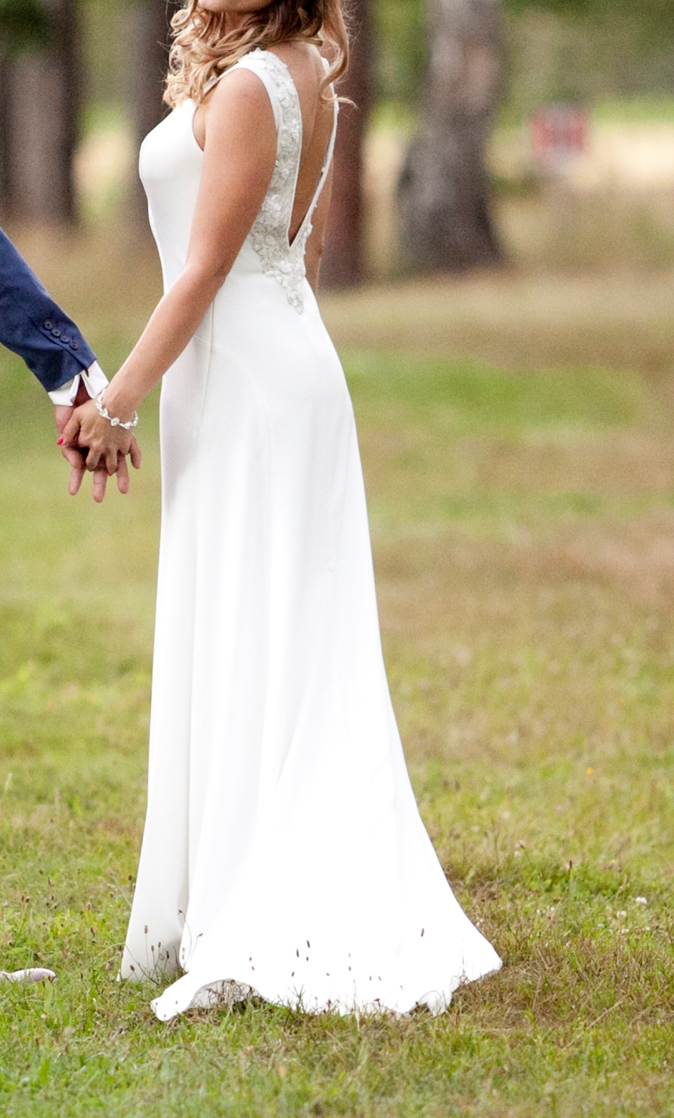 Z tyłu są głęboko wycięte plecy, ozdobione ręcznie wyszywanym sakarem, mieniącym się pod każdym kątem. Przód sukni – obramówka również ozdobiona sakarem, łezka pogłębiona. Suknia posiada również tren, podpinany na specjalny niewidoczny guzik. Do sukni dołączam również szal prześwitujący w kolorze ivory, do wykorzystania w przypadku złej pogody. Suknia wyczyszczona w profesjonalnej pralni, stan idealny. Wywołała niemałe poruszenie, goście byli nią zachwyceni- skromna i klasyczna. Czysta elegancja- naprawdę robi wrażenie.