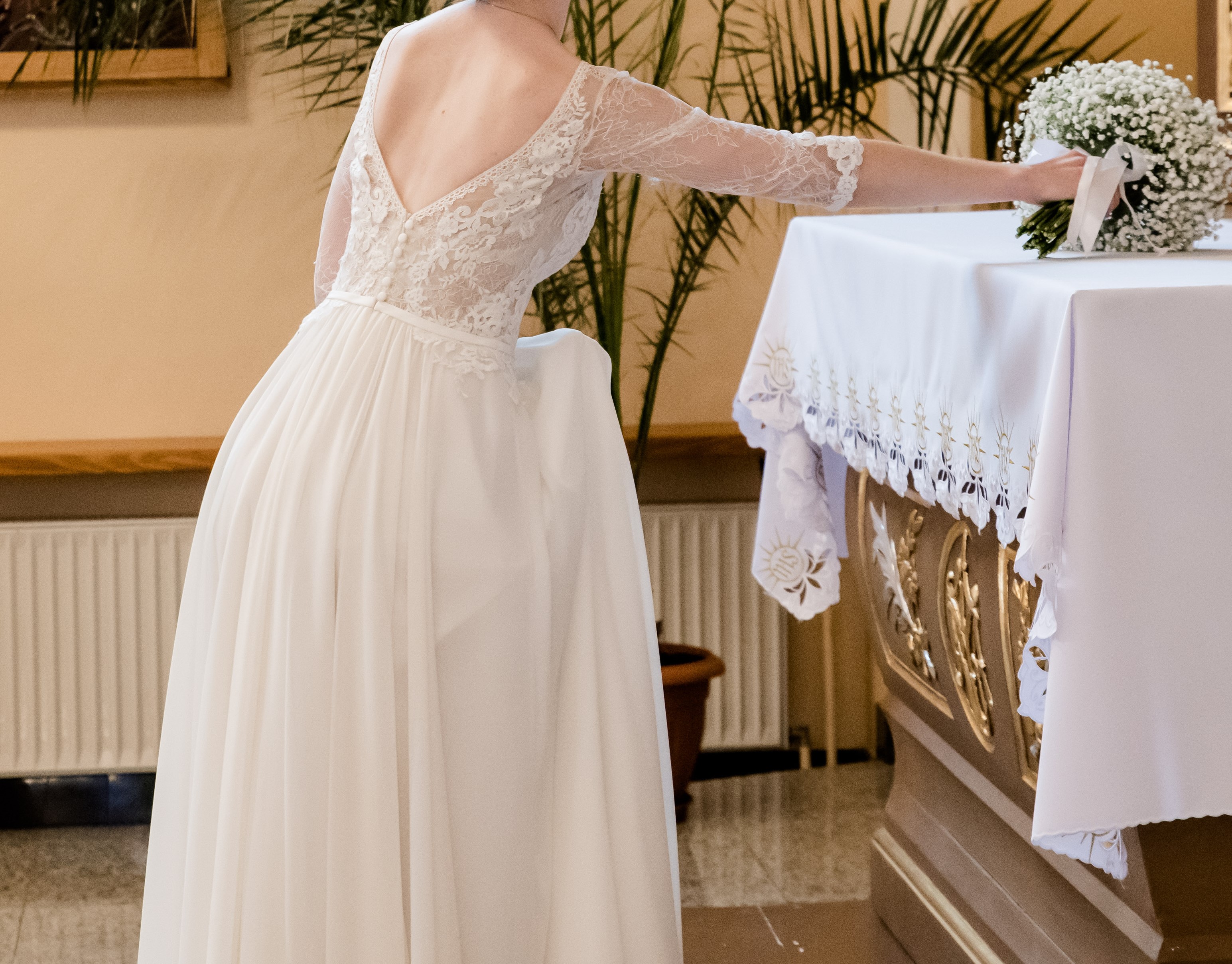Góra sukni jest koronkowa, zabudowana do kości obojczykowej, bez gorsetu, z podwójną podszewką w kolorze cielistym.
