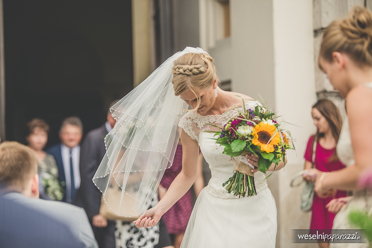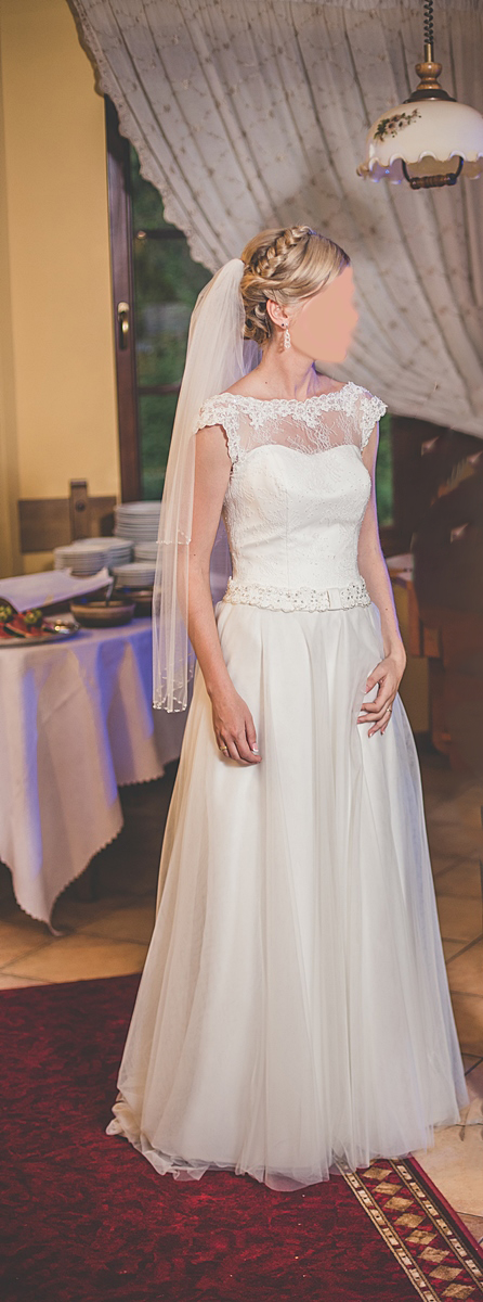 Sprzedam suknię ślubną marki Elizabeth Passion. Suknia w kolorze śmietanowym, rozmiar 36, szyta na wzrost 168 cm + obcas 5 cm. Góra sukni zabudowana koronką z kryształkami, plecy odkryte - w kształcie litery V. Dół sukni z tiulu jedwabnego, lejący, z długim trenem (możliwość podpięcia). Suknia niezniszczona, bardzo wygodna i lekka, nie posiada koła krępującego ruchy. Stan bardzo dobry. Do sukni dołączam tiulowy welon o dł. 90 cm zakończony kryształkami Swarovskiego oraz pokrowiec. Cena 600 zł za całość.