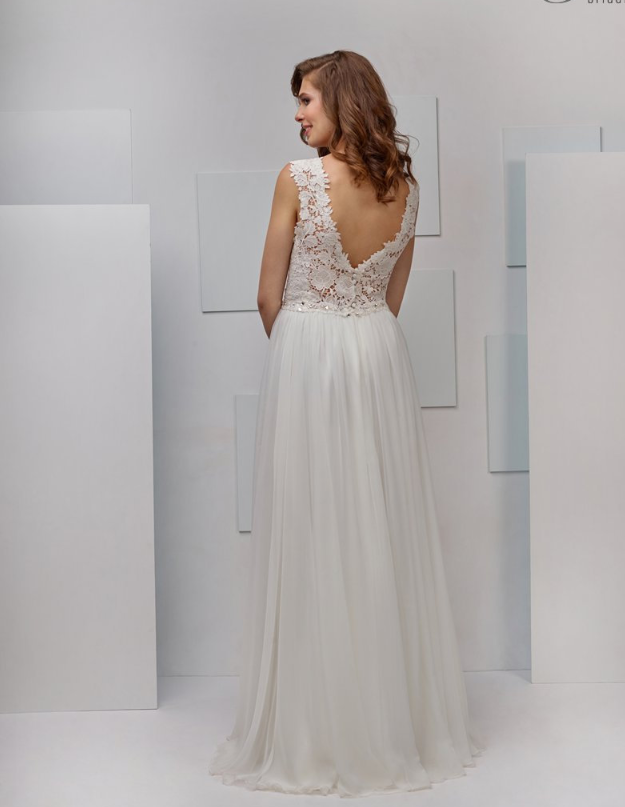 Delikatna suknia ślubna z muślinu. Gorset z dekoltem w kształcie litery V z przodu i z tyłu ozdobiony delikatną koronką. W talii srebrny, biżuteryjny pasek. Rozmiar 36-38 (Welon gratis)