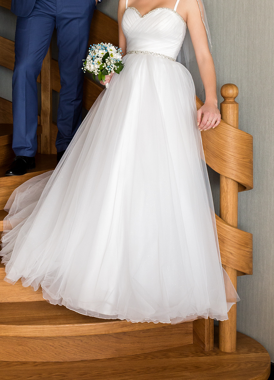 mam do sprzedania suknię ślubną typu Princessa w kolorze białym, rozmiar 36/38/40, srebrna tasiemka w pasie i na biuście, dekolt „serduszko”, brokatowy połysk na całej sukni, sznurowany gorset (możliwość regulacji rozmiaru 36-40), delikatne ramiączko (możliwość bez) + halka „mała” na kole. Welon jest dwuwarstwowy, na grzebyku, dłuższa warstwa ozdobiona kryształkami. Suknia pięknie układa się w tańcu, dzięki kilku warstwom tiulu. Szyta na wzrost 166 + obcas ok. 6-8 cm, ale tańcząc w balerinach płaskich też było wygodnie.