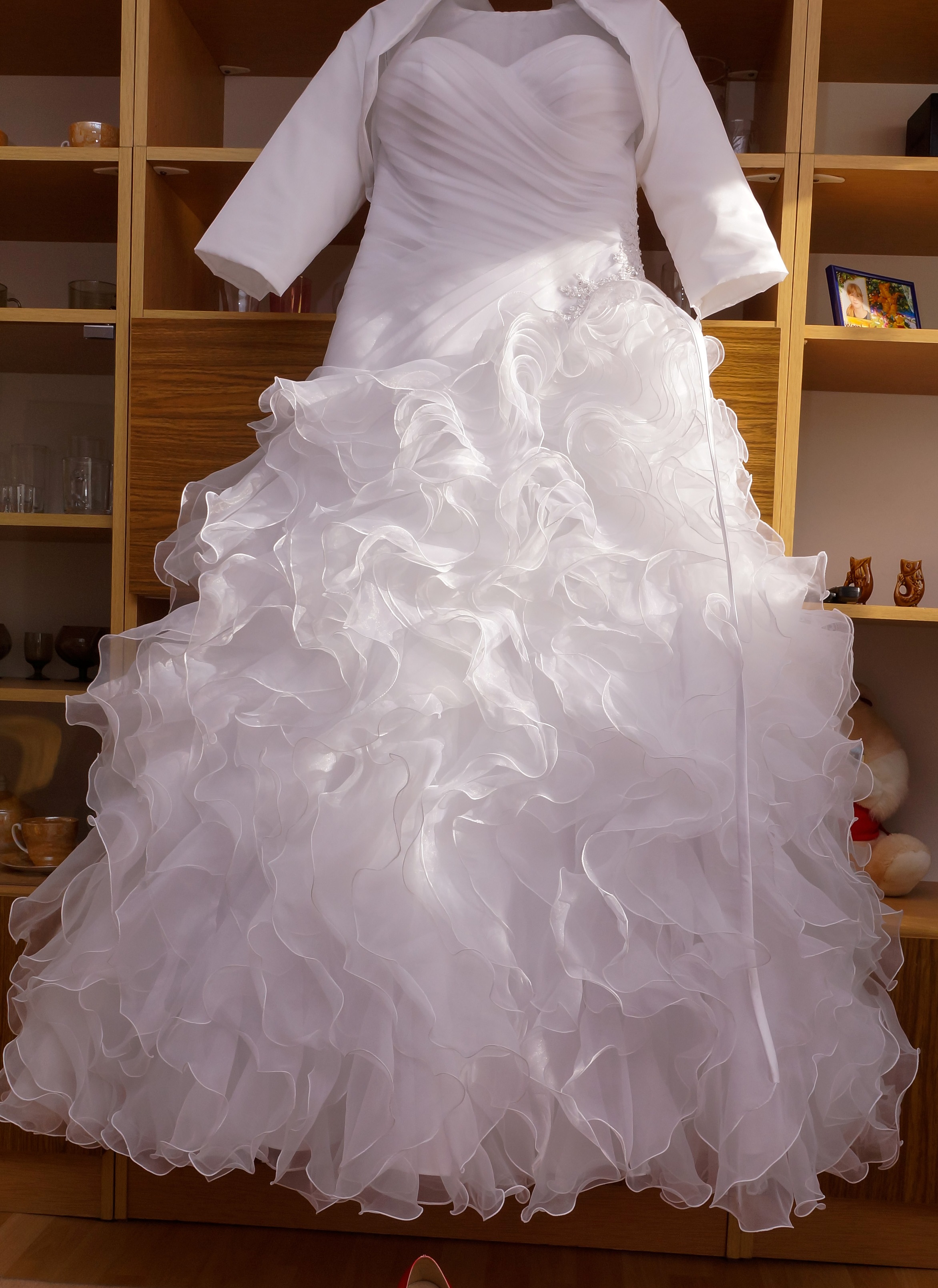 Suknia biała, nałożona raz, na osobę 174 cm + obcas 5 cm. Rozmiar 38 choć będzie pasować i na szczuplejsza osobę i grubsza że względu na regulację. Polecam