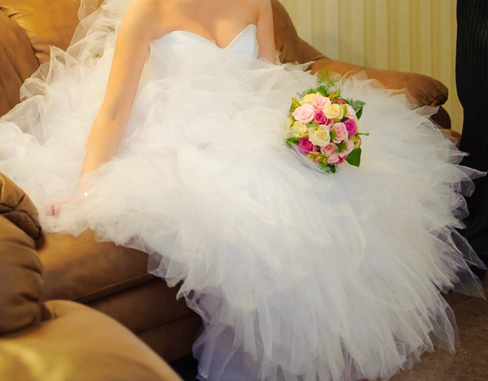 Tiulowa suknia ślubna z trenem (welon+etola+woalka gratis)Suknie ślubne » Podlaskie » Białystok