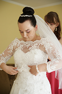 suknia jest bez trenu. suknia wiązana z tyłu.przyszyte są miseczki(można odpruć , suknia wykonana jest z organzy na gorsecie jest ozdobiona koronką z delikatnymi kamyczkami. na dole jest wykończona tasiemka z atłasu .dołączam gratis kolo z regulacja,