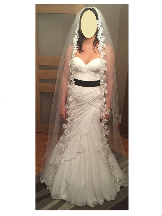 Do sprzedania mam również dwa welony. Jeden krótki z czarną lamówką. Drugi długi, lekko ciągnący się po ziemi, z przepiękną gipuirą.