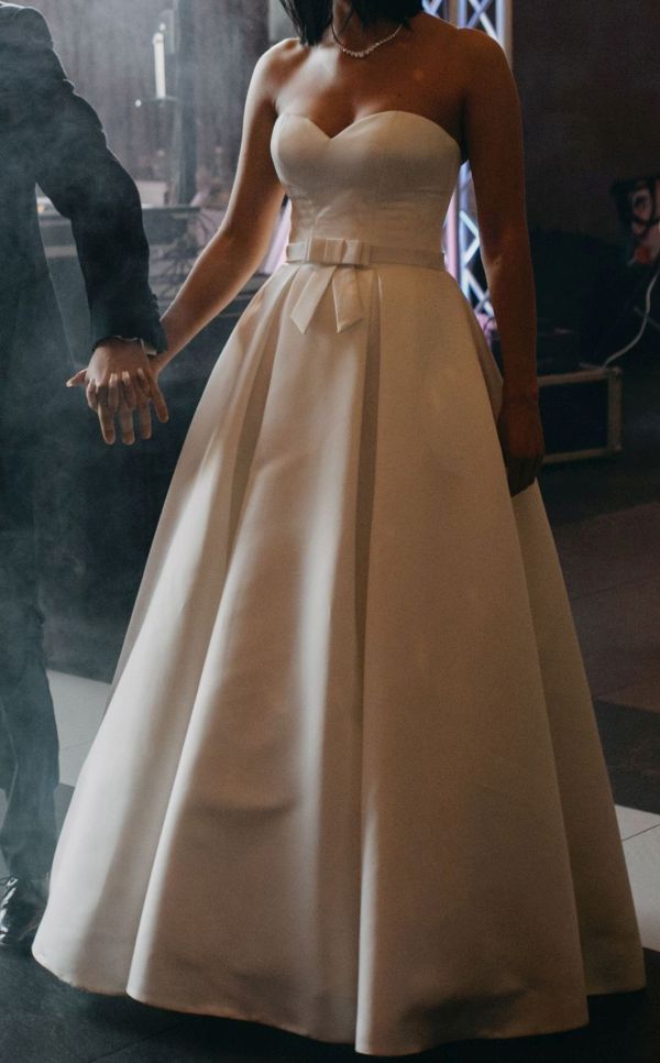 Bardzo elegancka, satynowa, klasyczna suknia ślubna w kolorze perłowej bieli. Stan idealny. Wybrana spośród dziesiątków przymierzonych modeli.