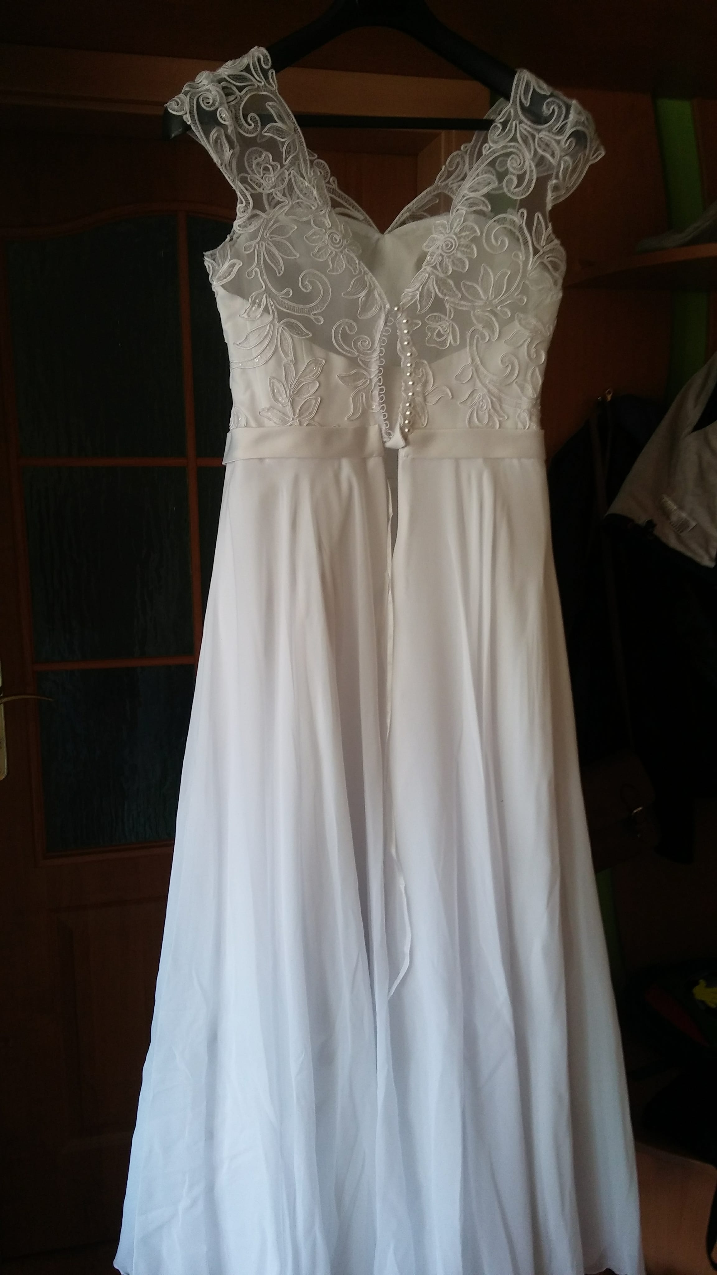 mam do sprzedania suknię ślubną. Założoną dwa razy ślub oraz sesja ślubna). Stan bardzo dobry. Lekka i bardzo wygodna.Suknia ma lekko gorsetową, usztywnianą górę, muślinowy dół, z tyłu zapinana na guziczki.