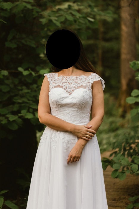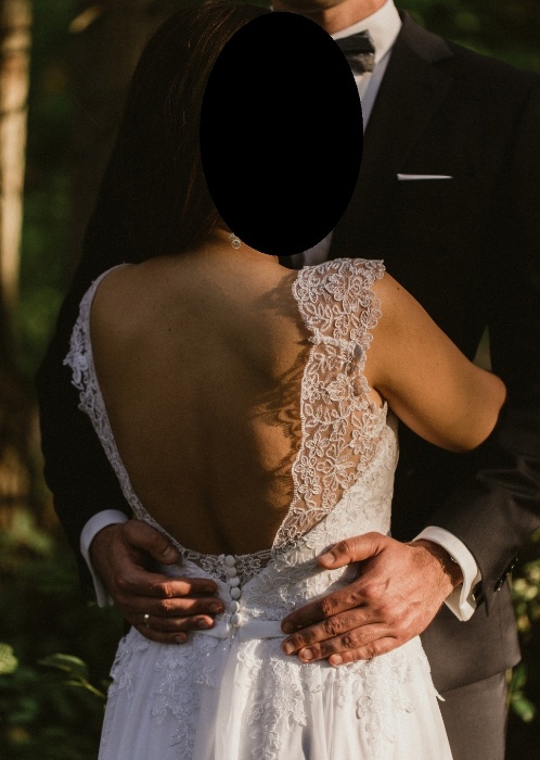 Sprzedam suknię ślubną muślinową z wycięciem V na plecach. Szyta na miarę w pracowni krawieckiej. Na co dzień noszę rozmiar 36/38. Szyta pod wzrost 171 cm + obcas 7 cm.