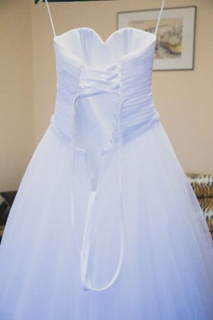 suknię ślubną w kształcie litery A, w kolorze śnieżnej bieli. Dół jest z tiulu z brokatem, która przy świetle sali balowej daje nieziemski efekt- ślicznie układa się w tańcu. Suknia jest bardzo wygodna, sznurowana z tyłu co pozwala na dopasowanie do rozmiarów 36-40. Założona była tylko dwa razy, nie jest uszkodzona, została wyprana chemicznie.