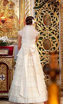 Fason sukni - linia "A", tworzy coś na kształt choineczki, składa się z pasów nachodzących jeden na drugi, „pod spodem” ma dużo zakładek nadających jej śliczną formę. Całość jest jednoczęściowa, gorset wysadzany kamyczkami z cudowną kokardą z tyłu. Ponieważ jest szyta pod biust pasuje również na panie w nie zaawansowanej ciąży. Sukienka ma doszyte ramiączka, które można odpruć w razie potrzeby. Bardzo wygodna, nie sprawiała żadnych „problemów technicznych”.