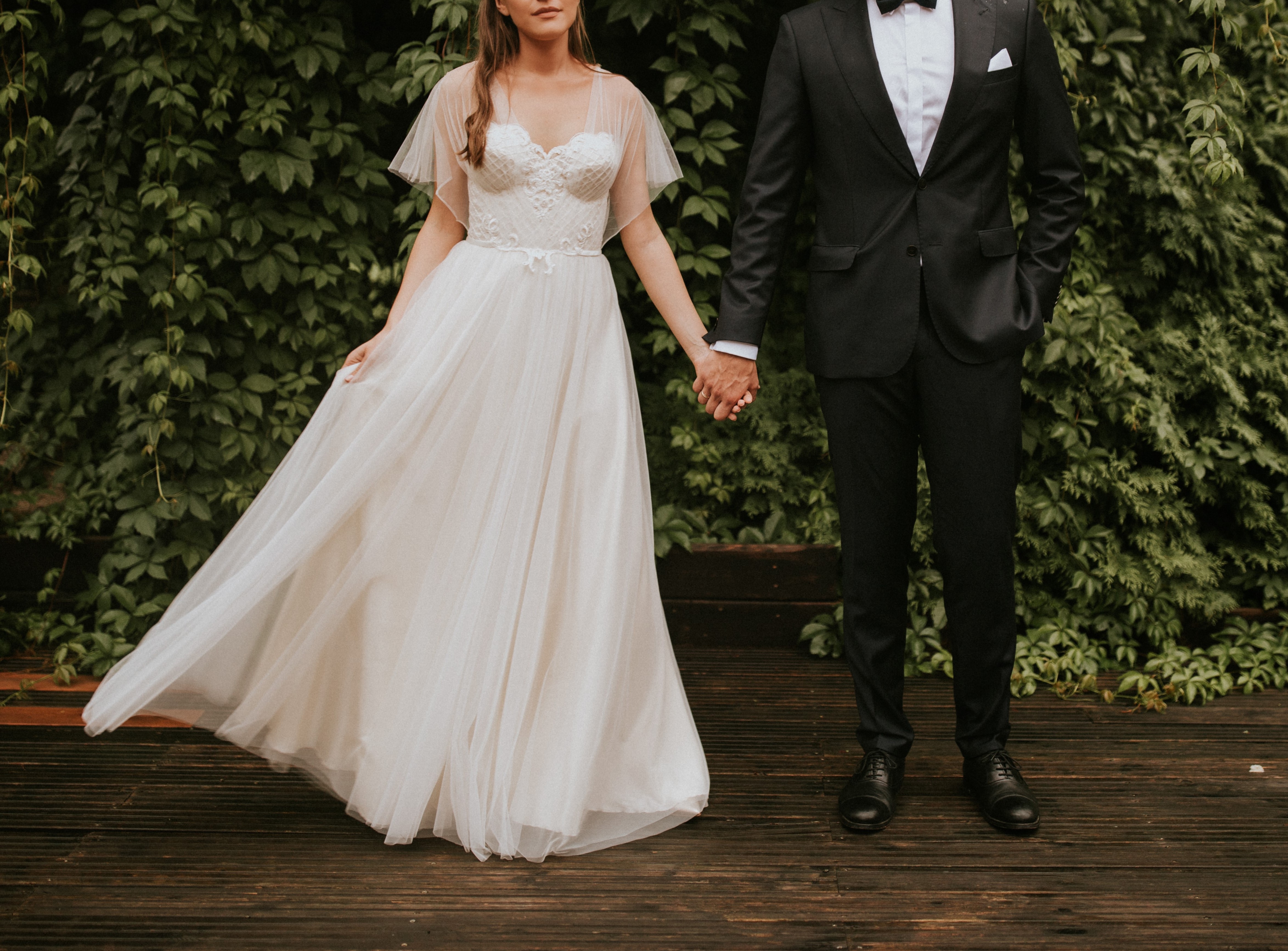 Pod warstwą tiulu znajduje się satynowy, złoto/perłowy materiał, który w ruchu delikatnie prześwituje. Dzięki temu suknia nie jest śnieżnobiała, za to bardzo ładnie rozświetla i ociepla kolor skóry.