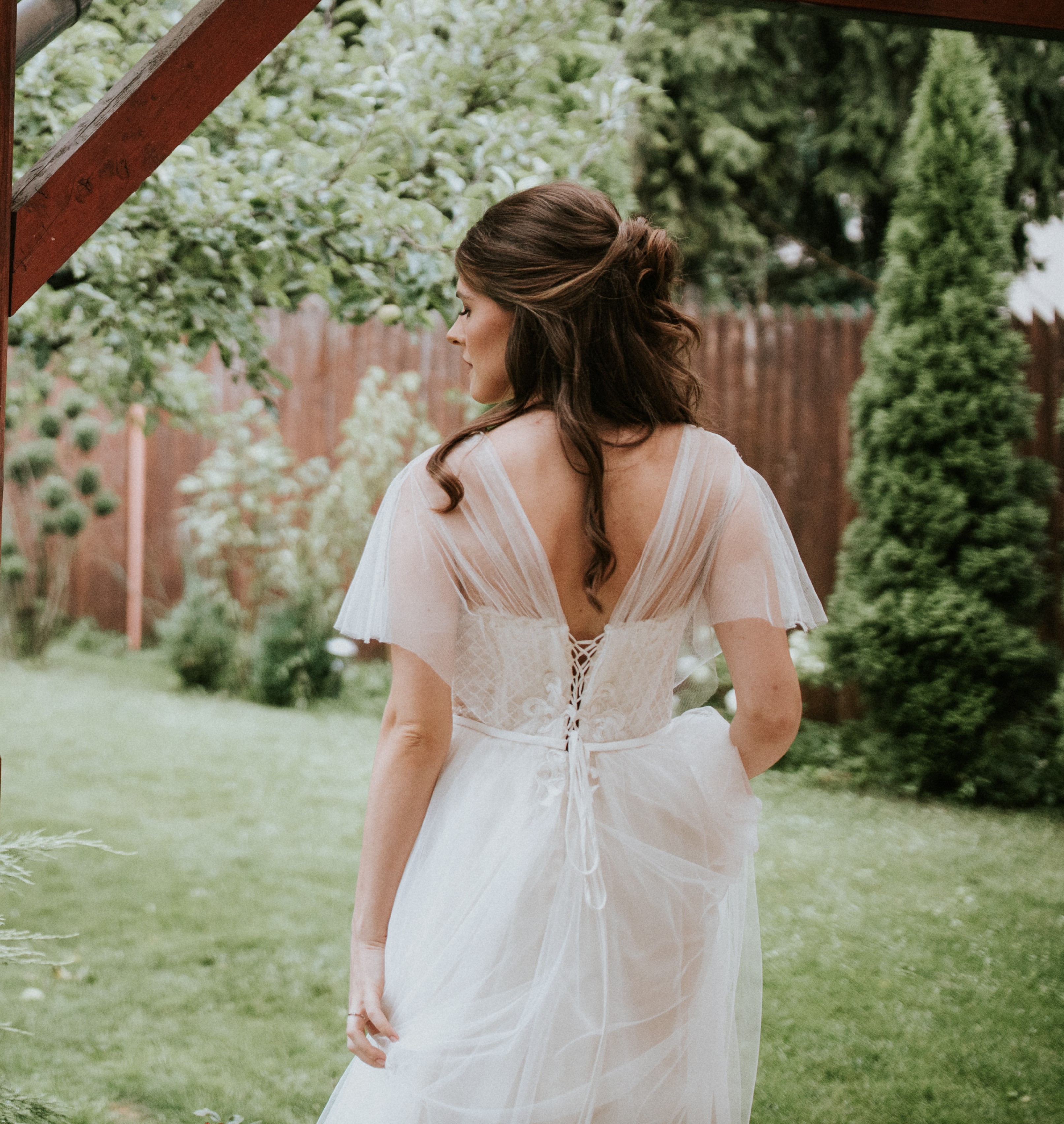 Suknia jest bardzo wygodna i łatwo można ją dopasować. Na dekolcie jest cieniutka siateczka dodatkowo utrzymująca suknię, jednak nie widać jej na zdjęciach i na żywo również jest ledwo widoczna.