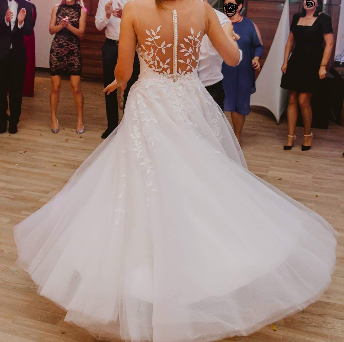 Suknia posiada w talii ozdobny pasek, który można odpiąć. Włoski tiul i koronki. Delikatne listki ułożone są na siateczce, która daje wrażenie jakby była na ciele. Tył sukni zdobi również koronka w listki oraz zapinane guziki.