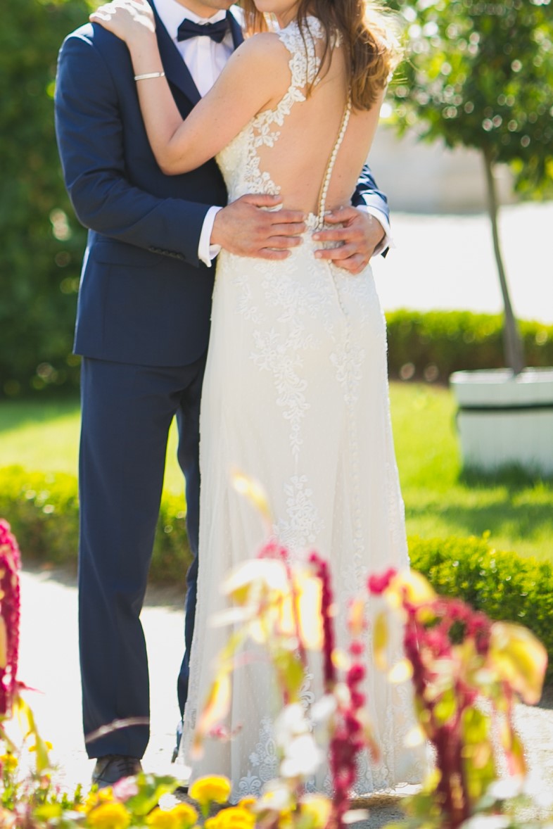 Głeboki dekolt w kształcie litery V można zagęścić koronką. Na plecach delikatna siateczka w kolorze cielistym, ozdobiona guziczkami.