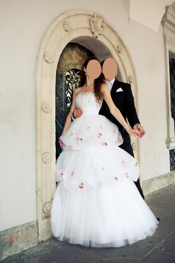 Oferuję do sprzedaży wyjątkową, ekstrawagancką suknię ślubną Divona. Suknia jest na wzrost 170 cm + ok.8 cm obcas (możliwość skrócenia-we własnym zakresie), rozmiar 36/38 (wiązana z tyłu), w kolorze białym z pięknymi kryształowymi zdobieniami na biuście (efekt powiększenia ;) ) oraz niespotykanymi, sztucznymi płatkami róż w falbanach sukni. Całość kompletu stanowi: suknia + halka z kołem.