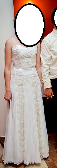 Suknia wykonana została z muślinu i jedwabiu a ozdobiona pionowymi taśmami z kamyczkami Swarovskiego oraz perełkami. Dzięki dobrej jakości materiałom jest lekka i zwiewna, oraz pięknie układa się w tańcu. Nie potrzebujesz do niej halki z kołem – wystarczy halka z tiulem, która lekko uniesie suknię. Do tego posiada wewnętrzny, modelujący, wiązany gorset dzięki czemu suknia się nie obsuwa tylko idealnie leży na swoim miejscu przez całą noc!