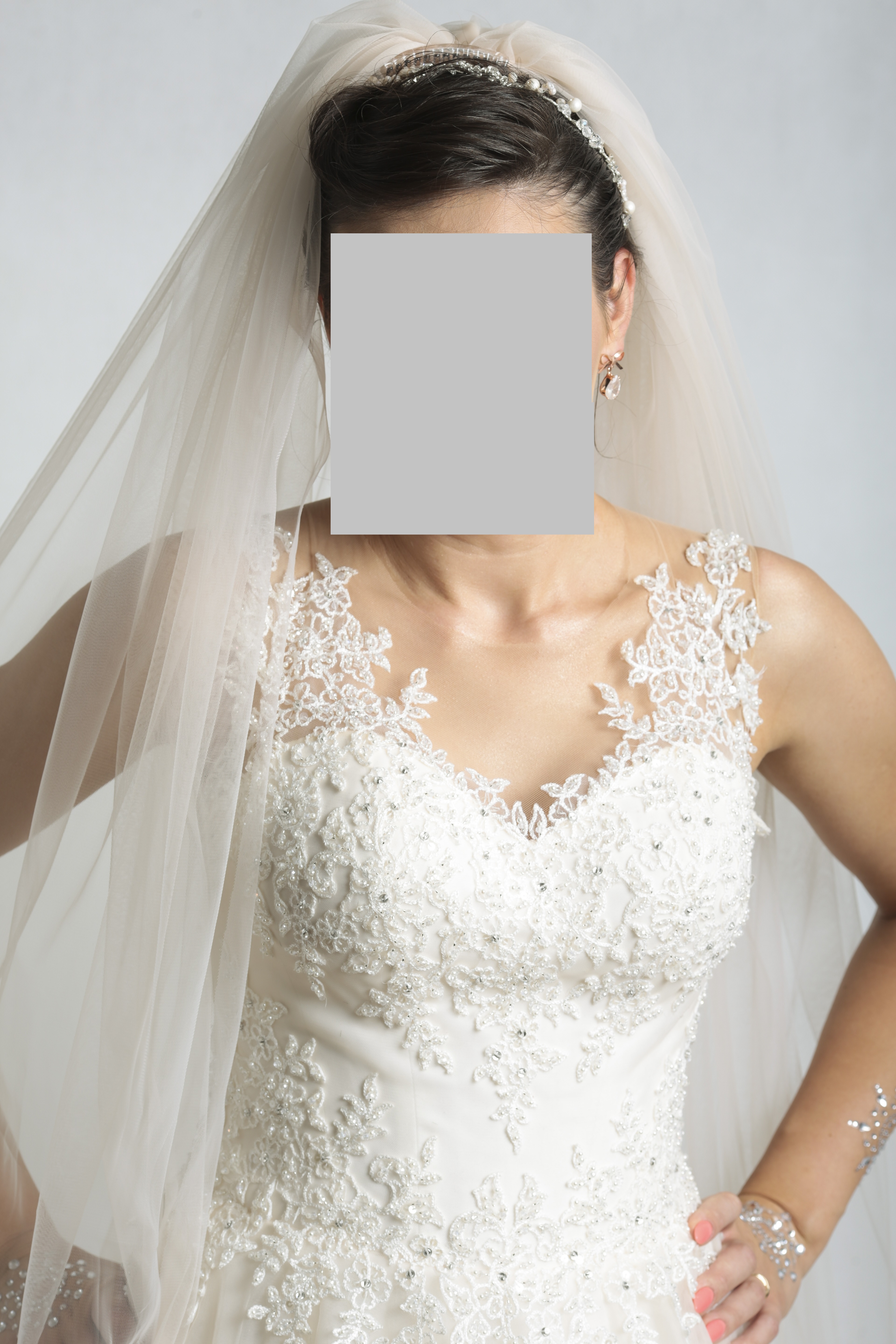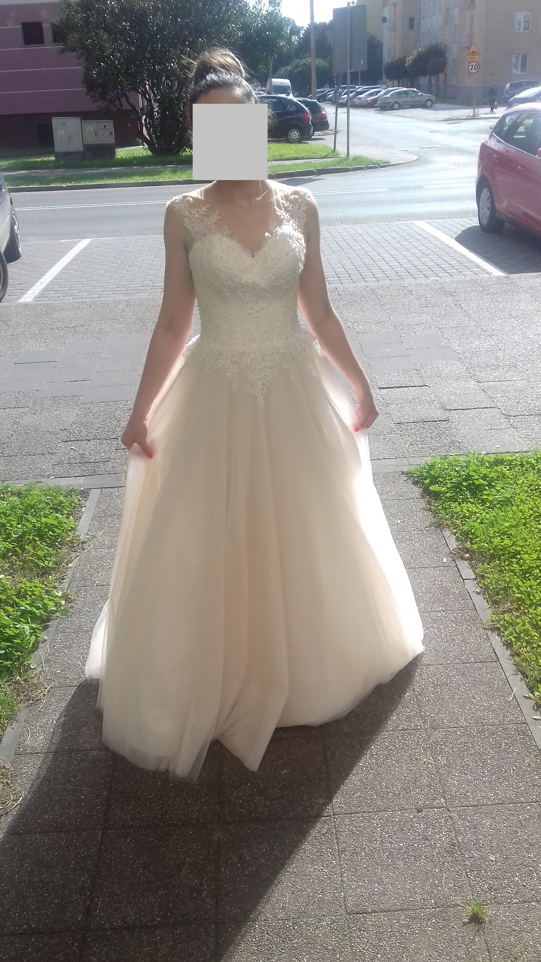 Suknia jest biała otulona tiulami jedwabnymi w kolorze pastelowej moreli, składa się z gorsetu, koronkami na siatce i spódnicy tiulowej z małym trenem- wszystko połączone w jedną suknię.