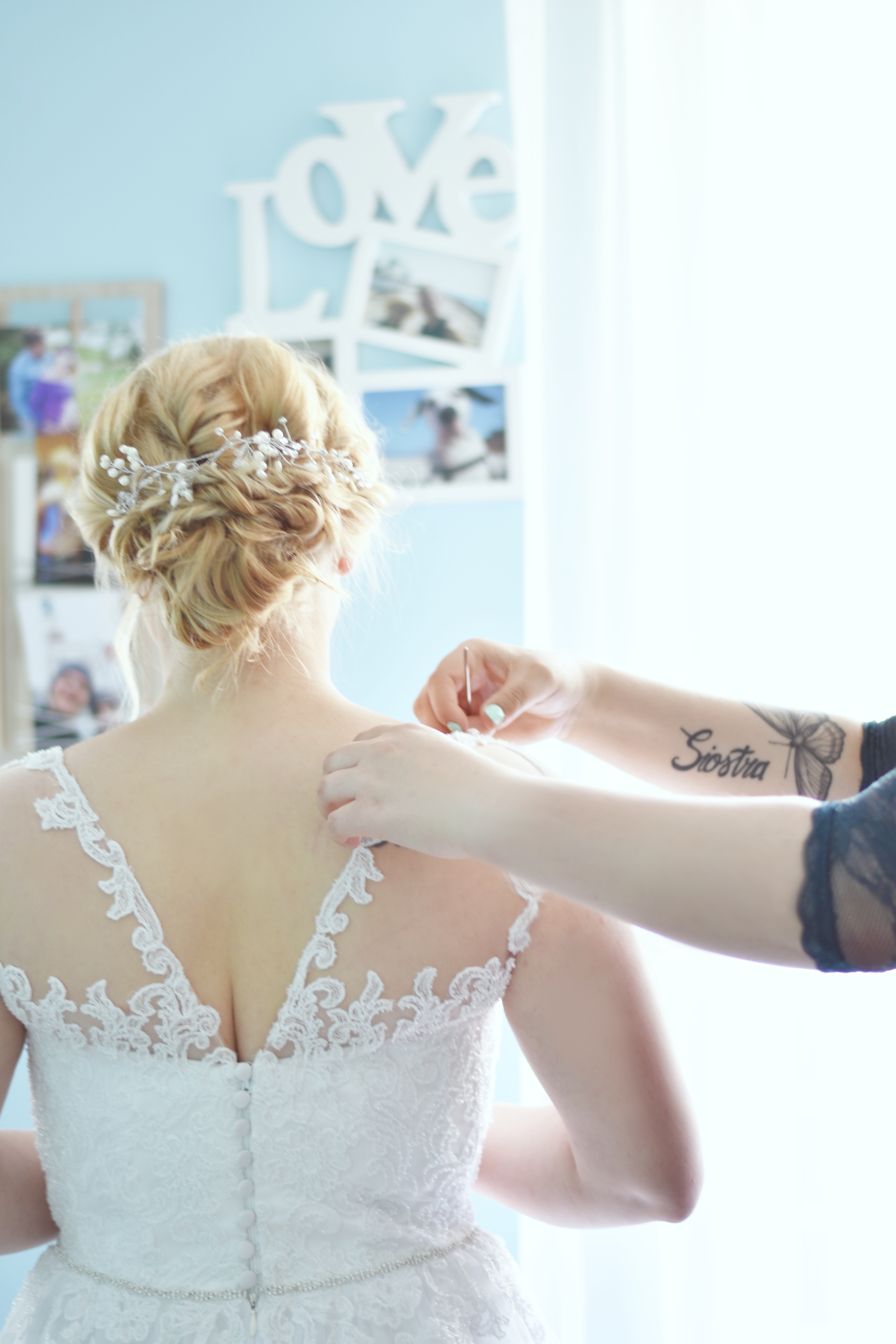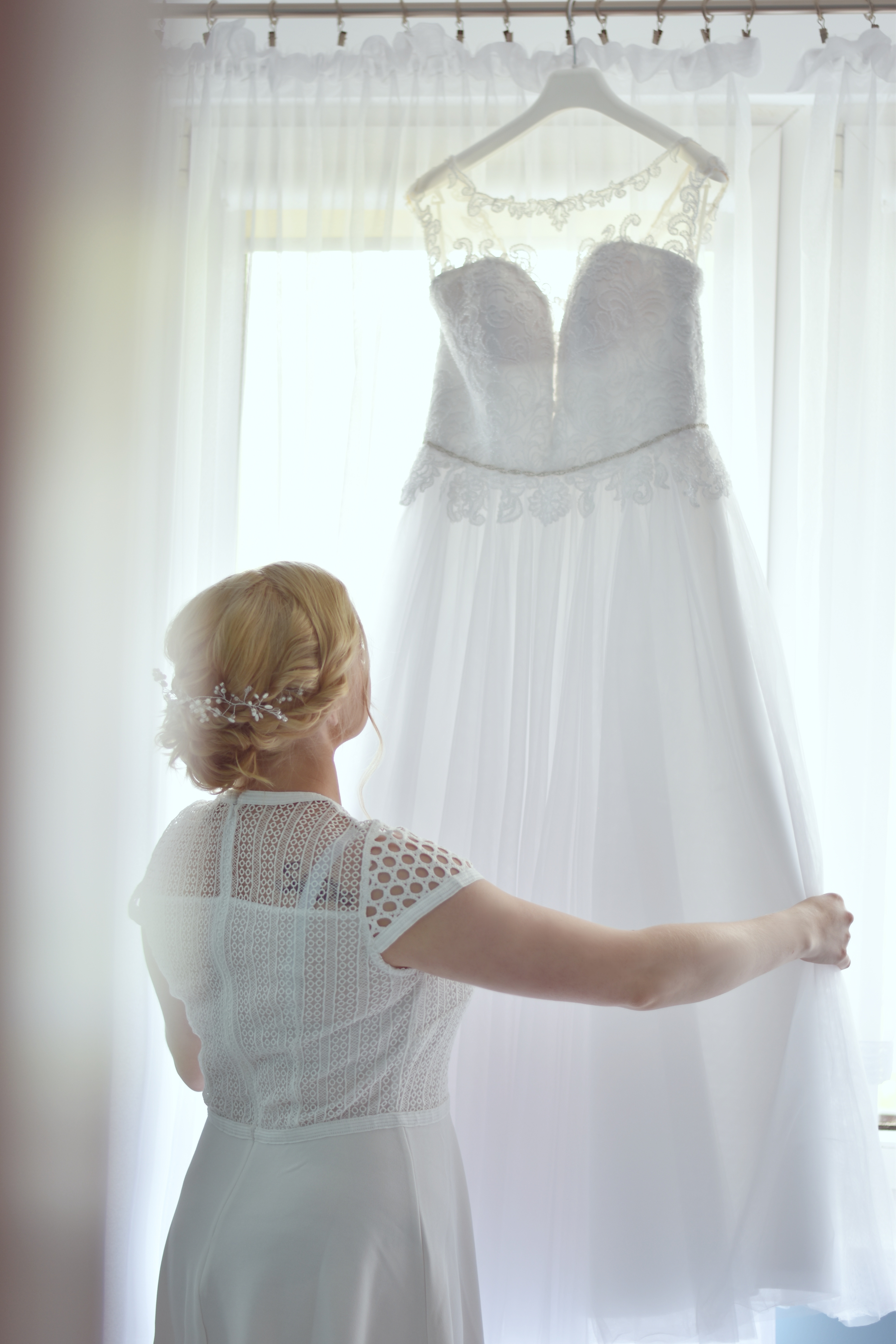 U góry piękne wykończenie z delikatnych koralików, dekolt w literę V, dół tiulowy, z tyłu gorset i zapięcie na guziki, również wycięcie w literę V. Wszyte miseczki, nie potrzeba biustonosza.